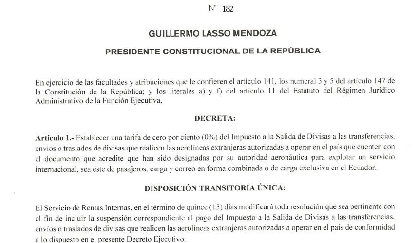 Decreto Ejecutivo N° 182: Tarifa 0% ISD Aerolíneas Deja un comentario / DECRETOS EJECUTIVOS / 7 de septiembre de 2021 7 de septiembre de 2021