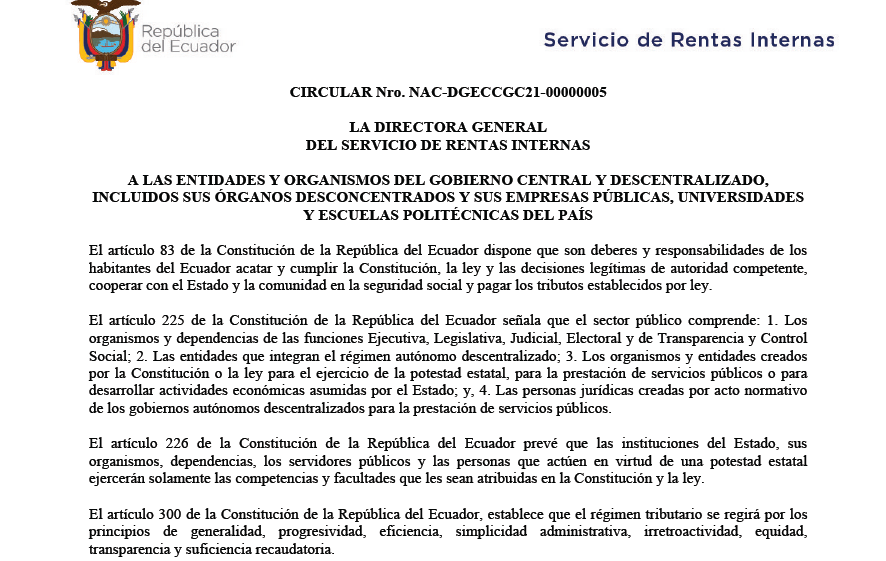CIRCULAR Nro. NAC-DGECCGC21-00000005: A LAS ENTIDADES Y ORGANISMOS DEL GOBIERNO CENTRAL Y DESCENTRALIZADO, INCLUIDOS SUS ÓRGANOS DESCONCENTRADOS Y SUS EMPRESAS PÚBLICAS, UNIVERSIDADES Y ESCUELAS POLITÉCNICAS DEL PAÍS Deja un comentario / CIRCULARES / 7 de septiembre de 2021 7 de septiembre de 2021